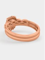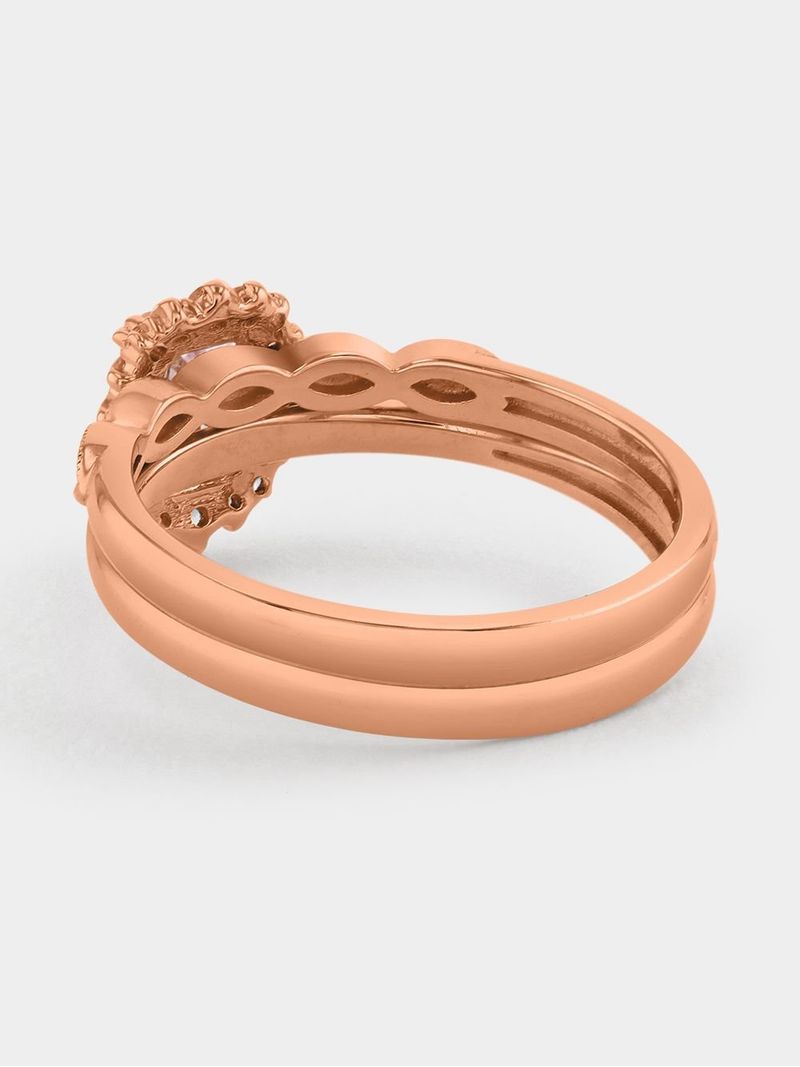 Expertly crafted in 9ct Rose Gold, this opulent ring features an oval-cut Pink Morganite embraced by a glittering halo of round-cut Diamonds and Created White Sapphires enhanced by an intricately detailed vintage-style band.