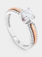 Expertly crafted in 9ct Rose Gold and Sterling Silver, this beautiful ring features a round-cut Moissanite and an elegantly pinched band glittering with pavé set stones. A pair of tube-set Created Pink Sapphire, symbolic of love and loyalty, sparkle on the gallery.