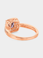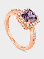 Expertly crafted in Rose Plated Sterling Silver, this beautiful ring features a cushion-cut amethyst purple Cubic Zirconia embraced by a halo of round-cut white stones and an elegantly pinched band glittering with pavé set stones.