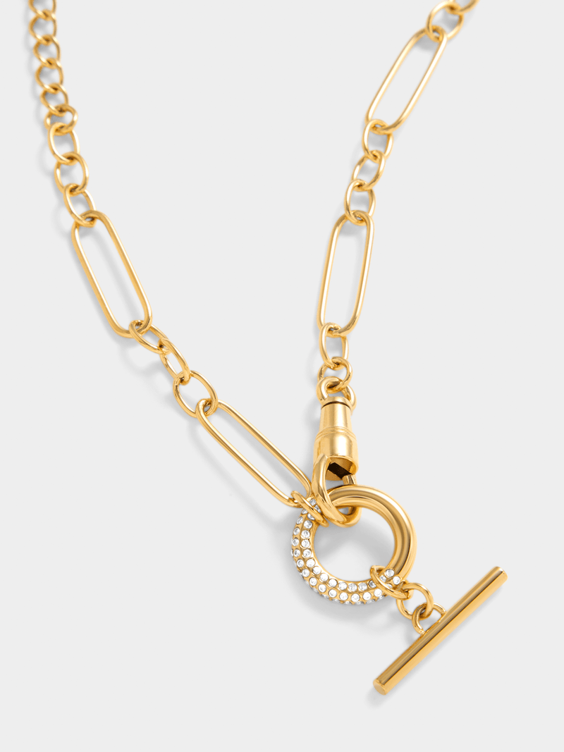 Expertly crafted in Gold Plated Stainless Steel, this stylish 19cm paperclip bracelet features a T-bar toggle accent glittering with pavé set Cubic Zirconia. All Tempo Jewellery is hypoallergenic, waterproof and durable, boasting a 1-year guarantee.