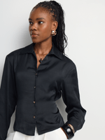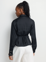 Our Satin Belted Shirt features a delicate waist tie and a sleek silhouette. Wear it with smart trousers and sock boots for a chic office look.