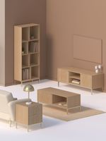 The Self Assembly Five5 Tasso Coffee Table brings a fresh, modern feel to your home with its light wood-look finish, on-trend fluted details, and gold-tone metal handles and base. Stylish and practical, this coffee table includes an open shelf for displaying decor and books, and a drawer for concealed storage.
