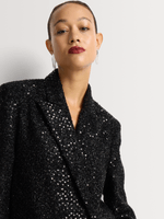 Add sparkle to any look with our Sequin Asymmetrical Placket Blazer. This statement piece can be worn with wide leg trousers, a mini skirt or layered over a maxi dress. Wear it with denim and a graphic tee for a different take.