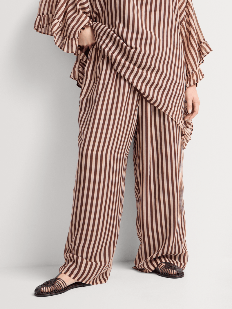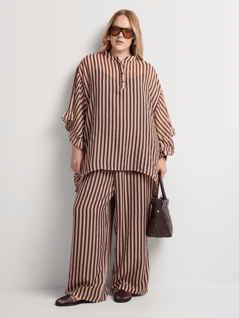 Our Sheer Stripe Wide Leg Pants elongate and flatter with their vertical stripe. Wear them with the matching top for an elegant co-ord set. Add understated flats or classic heels to complete the look.