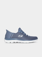 The Women’s Skechers Summits Slip-In in Blue/White offers the ultimate combination of "hands-free" convenience and sporty elegance. Featuring Skechers' revolutionary Hands Free Slip-Ins® technology, these sneakers allow you to step right in and go without ever touching the laces. The breathable athletic mesh upper in a serene navy blue is accented by a crisp white midsole, providing a clean, versatile look for everything from errands to light workouts. Inside, the Air-Cooled Memory Foam® insole contours to your foot for personalized comfort, while the Heel Pillow™ holds your foot securely in place. Lightweight, stylish, and incredibly practical, the Summits Slip-In is designed to keep up with your busiest days effortlessly.