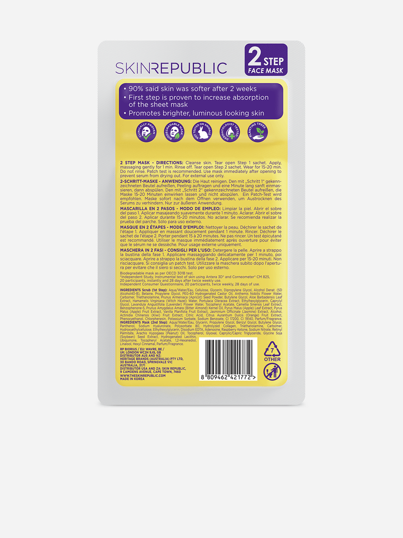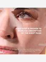 First step is proven to increase absorption of the sheet mask. Skin roughness reduced by 14% with smoother more hydrated skin and less wrinkles after one application.
