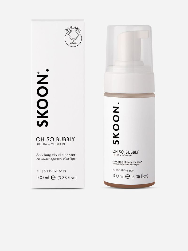Experience the refreshing sensation of our SKOON. OH SO BUBBLY Soothing Cloud Cleanser—a gentle yet powerful daily essential. This unique formula effortlessly lifts away dirt and impurities without compromising your skin's natural barrier or pH balance. Enriched with real Swiss yoghurt, honey, and betaine, it deeply hydrates, soothes sensitive skin, and promotes a healthy skin microbiome. Indulge in its luxurious, cloud-like foam, leaving your skin soft, revitalized, and primed for your skincare routine.