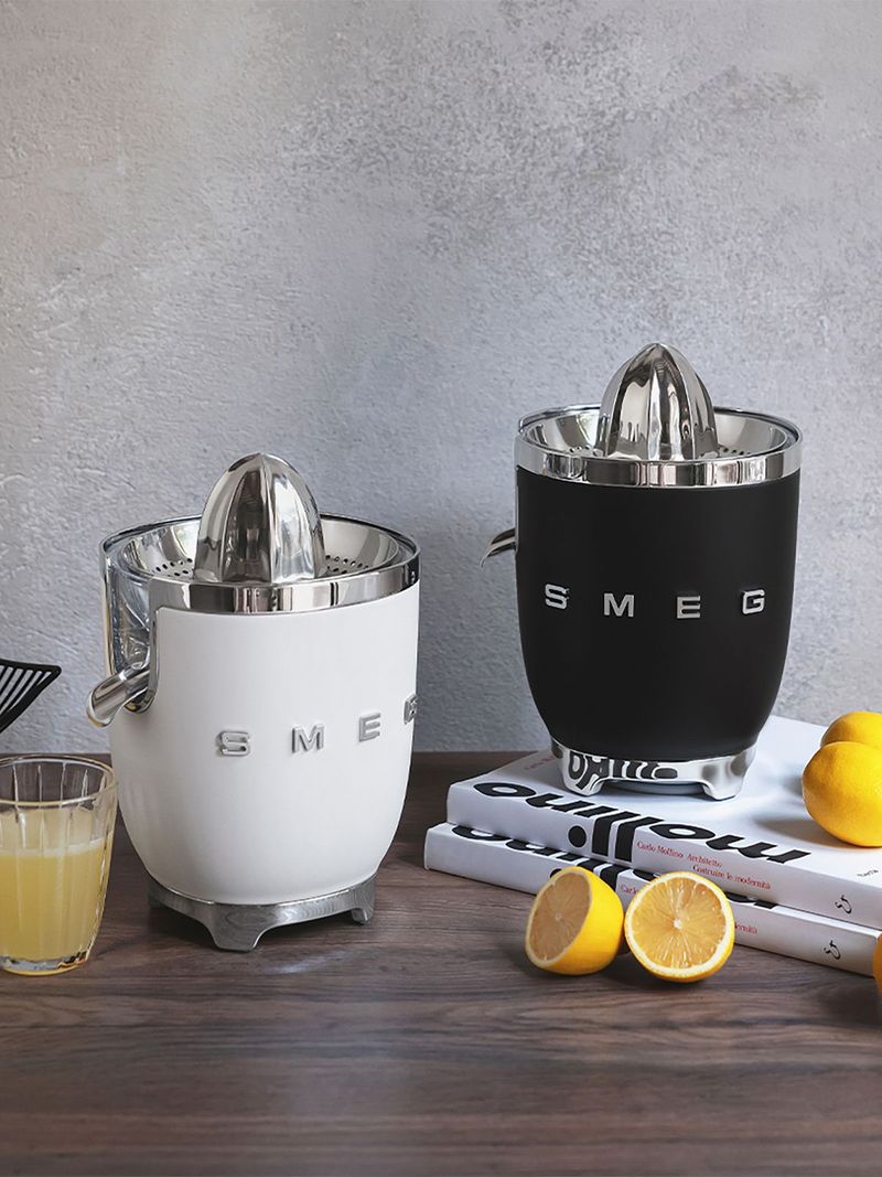 The Smeg Retro Citrus Juicer is a stylish addition to your countertop. Make delicious fresh citrus juices with this handy machine that features a stylish powder-coated body and stainless steel juicing elements.