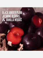 A floral gourmand perfume mist with intoxicating yet delicate notes of black amber plum, vanilla woods, and jasmine blooms.
