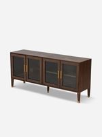 The Sonora Sideboard brings a moody elegance to your decor with its dark walnut finish, antique-inspired Shagreen inlay detail, and brass hardware. Stylish and practical, this generously sized sideboard offers both cupboard and shelf storage for glassware, crockery, or decorative items, with clear glass doors that bring a display element to the piece.