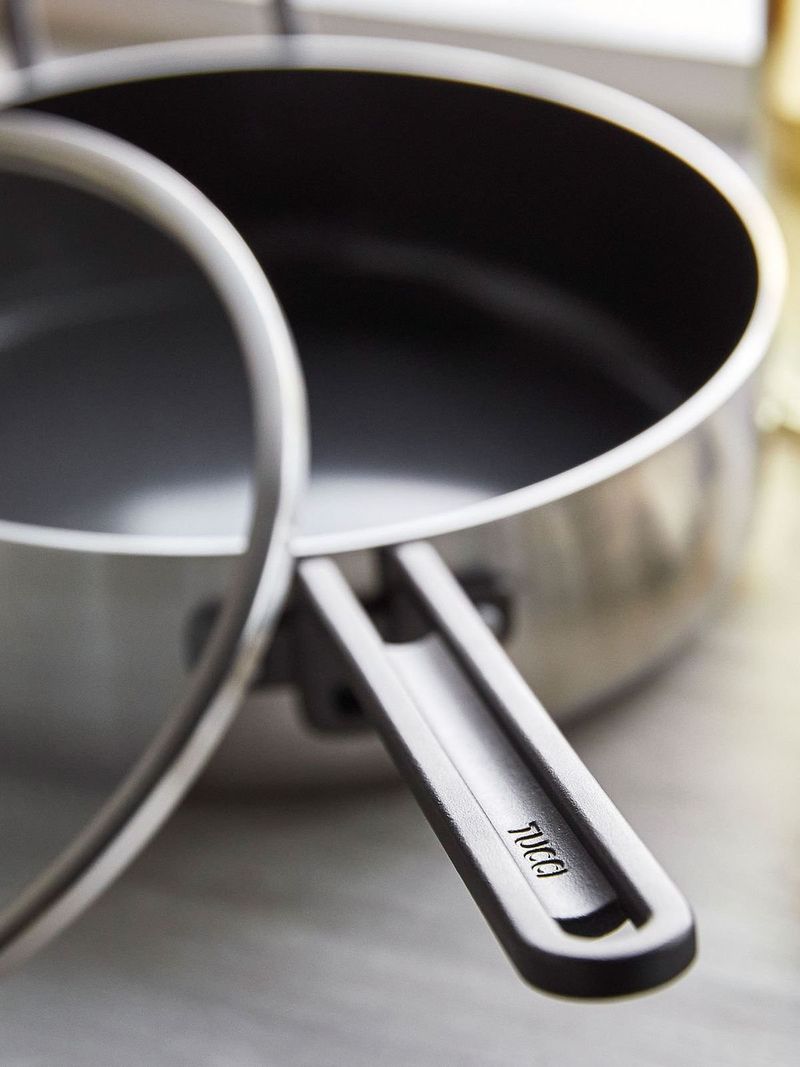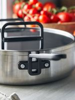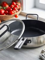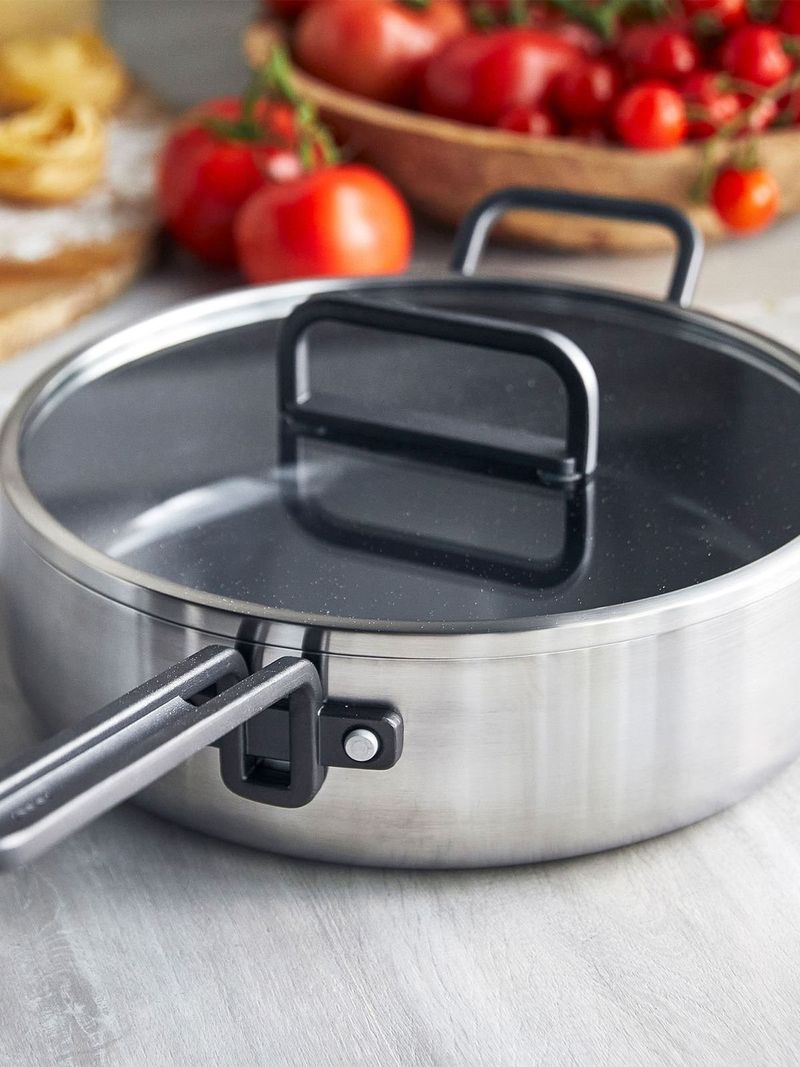 • Tight-fitting tempered glass lids are reinforced with stainless-steel rims that match each pan’s body for a seamless look.