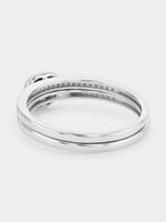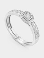 Expertly crafted in Sterling Silver, this radiant twinset ring features a full-cut Lab Grown Diamond embraced by a cushion-shaped halo of single-cut stones that also sparkle on the bands. The total Diamond weight is 0.26 carats.