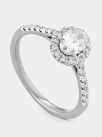 Expertly crafted in Sterling Silver, this beautiful ring features an oval-cut Lab Grown Diamond embraced by a halo of full-cut stones and a band glittering with pavé set stones. The total Diamond weight is 0.77 carats.