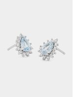 Expertly crafted in Sterling Silver, these elegant stud earrings feature pear-cut aquamarine Cubic Zirconia embraced by a halo of round-cut white stones.