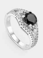 Expertly crafted in Sterling Silver, this opulent ring features a round-cut black Cubic Zirconia embraced by a demi-halo of round-cut white stones that also glitter on the split-shank band