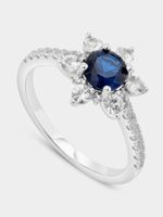 Expertly crafted in Sterling Silver, this beautiful ring features a round-cut Blue Spinel embraced by a bloom-inspired halo of round-cut Created White Sapphires including Earth Grown Diamond accents and a band glittering with pavé set stones.