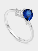 Expertly crafted in Sterling Silver, this beautiful ring features a pear-cut sapphire blue Cubic Zirconia and square-cut white stone.