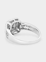 Expertly crafted in Sterling Silver, this beautiful ring features a cushion-shaped cluster of round-cut Cubic Zirconia in a double halo setting and a band sparkling with pavé set stones.