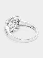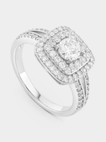 Expertly crafted in Sterling Silver, this beautiful ring features a round-cut Cubic Zirconia in a cushion-shaped double halo setting and a split-shank band glittering with pavé set stones
