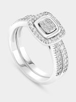 Crafted in Sterling Silver, this striking ring features a cushion-shaped cluster of Cubic Zirconia in a halo setting and bands that sparkle with pavé set stones.