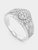 Expertly crafted in Sterling Silver, this radiant ring features an oval cluster of round-cut Cubic Zirconia in a halo setting and an infinity band sparkling with pavé set stones.
