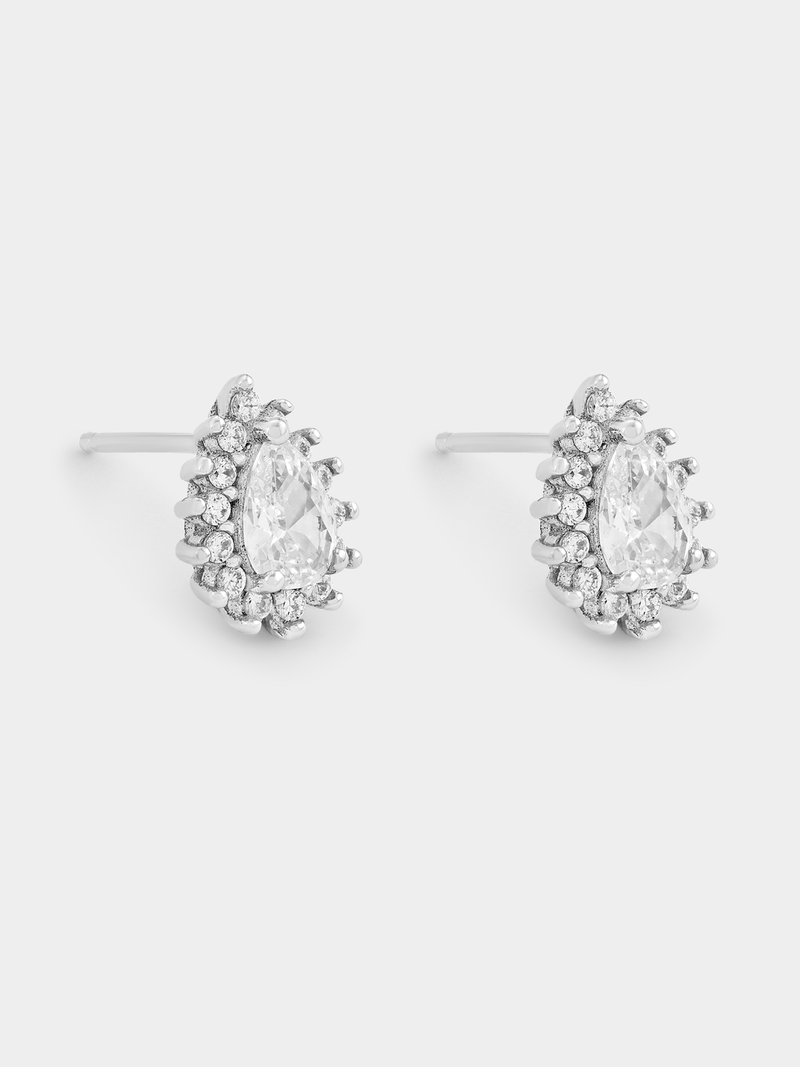 Expertly crafted in Sterling silver, these beautiful stud earrings feature pear-cut Cubic Zirconia in starburst halo settings glittering with round-cut stones.