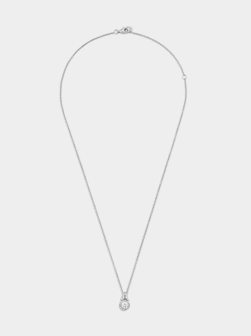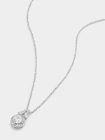 Expertly crafted in Sterling Silver, this beautiful pendant on a chain features a round-cut Cubic Zirconia in a halo setting adorned by a leaf design glittering with pavé set stones.