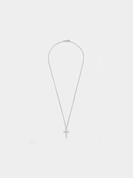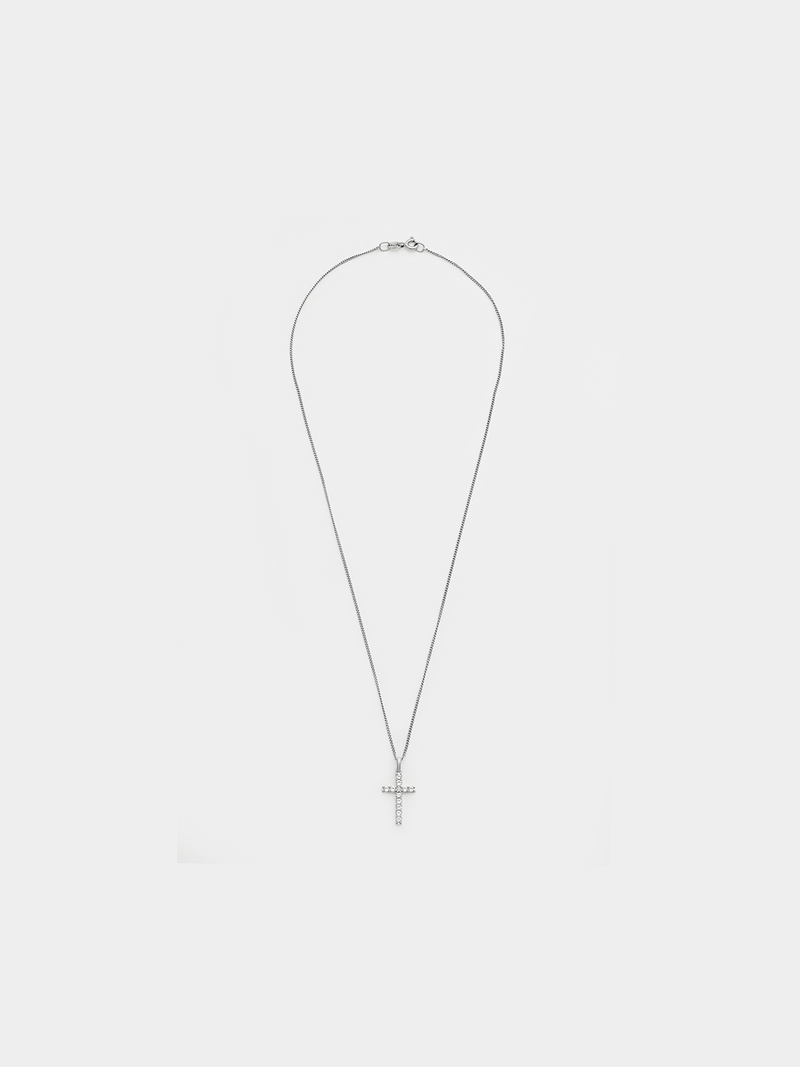 Expertly crafted in Sterling Silver, this radiant cross pendant on chain catches the light with round-cut Created White Sapphires and a Diamond.