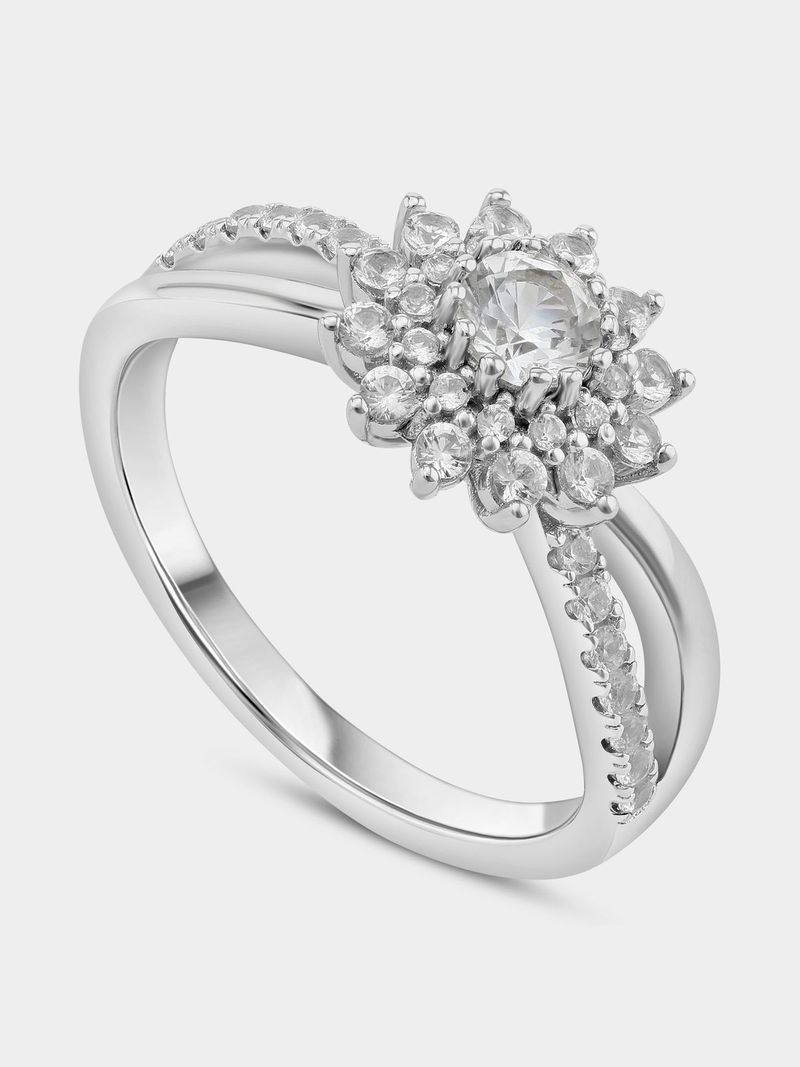 Expertly crafted in Sterling Silver, this radiant ring features a round-cut Created White Sapphire embraced by a celestial-inspired cluster of round-cut stones including Earth Grown Diamonds and a split-shank band sparkling with pavé set stones.