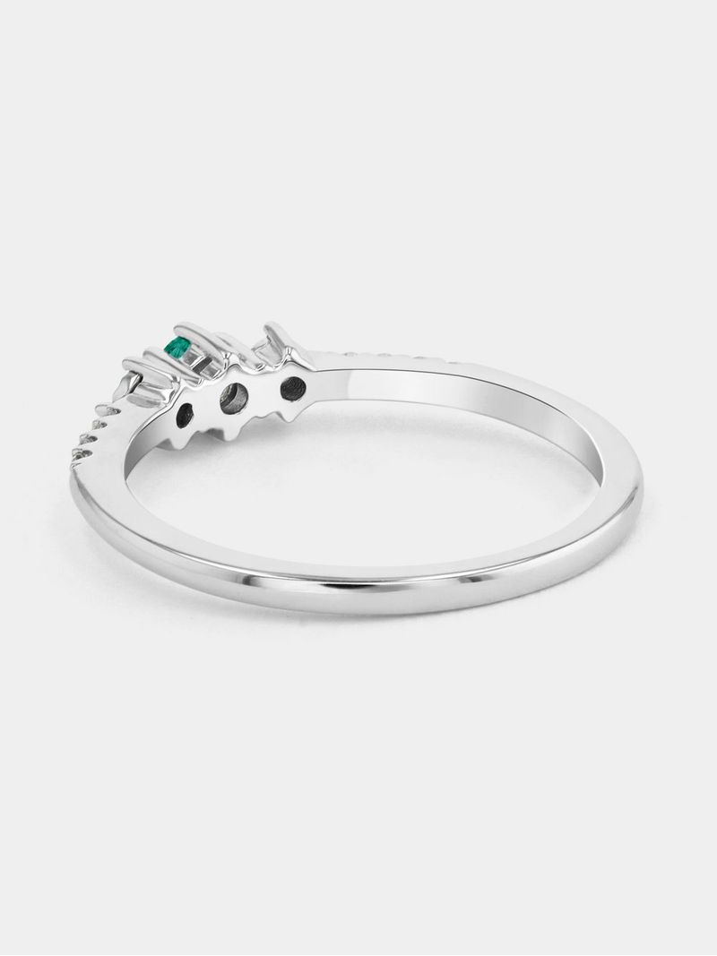 Expertly crafted in Sterling Silver, this romantic ring features a round-cut Green Emerald centre stone flanked by full-cut Diamonds and pavé set White Emeralds that sparkle on the band’s shoulders.