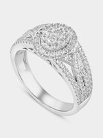 Expertly crafted in Sterling Silver, this romantic ring features an oval cluster of round-cut Earth Grown Diamonds and Created White Sapphires in a halo setting and an elegantly twisted split-shank band sparkling with pavé set stones.