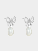 Expertly crafted in Sterling Silver, these beautiful bow drop earrings feature lustrous Freshwater Pearls and glitter with pavé set Cubic Zirconia.