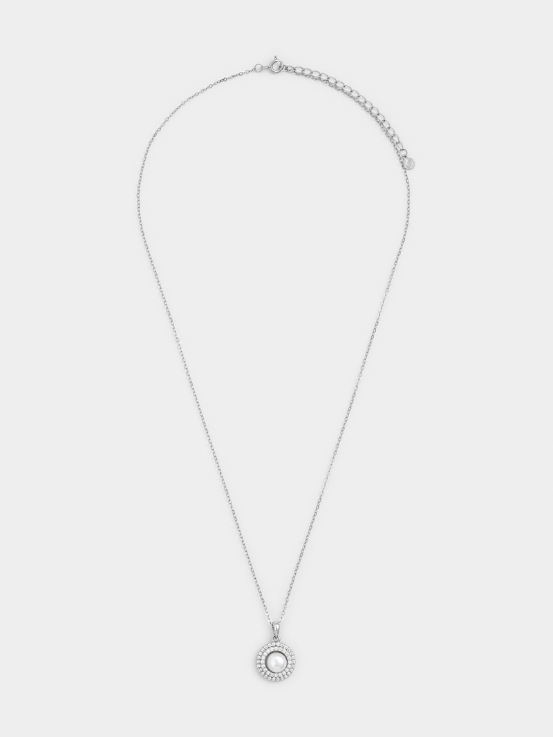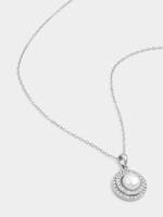 Expertly crafted in Sterling Silver, this elegant pendant on a chain features a lustrous freshwater Pearl embraced by a double halo of pavé set Cubic Zirconia.