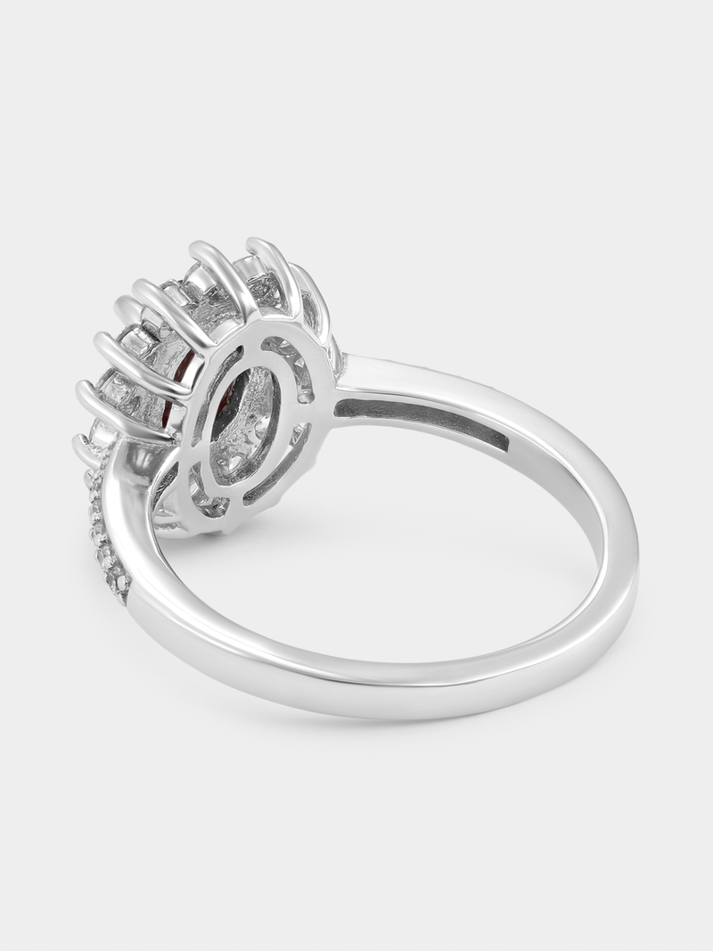 Expertly crafted in Sterling Silver, this beautiful ring features an oval-cut garnet-coloured Cubic Zirconia embraced by a starburst-shaped halo of round-cut white stones.