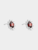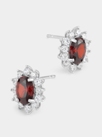 Expertly crafted in Sterling Silver, these beautiful stud earrings feature oval-cut garnet-coloured Cubic Zirconia embraced by a starburst-shaped halo of round-cut white stones.