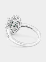 Expertly crafted in Sterling Silver, this regal ring features an oval-cut emerald green Cubic Zirconia embraced by a starburst-style halo of round-cut white stones and a band glittering with pavé set stones.