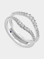 Expertly crafted in Sterling Silver, this elegant ring jacket features elegantly curved bands sparkling with pavé set Moissanite. A Created Blue Sapphire, symbolising eternal love, truth and faithfulness, is hidden in the shank.