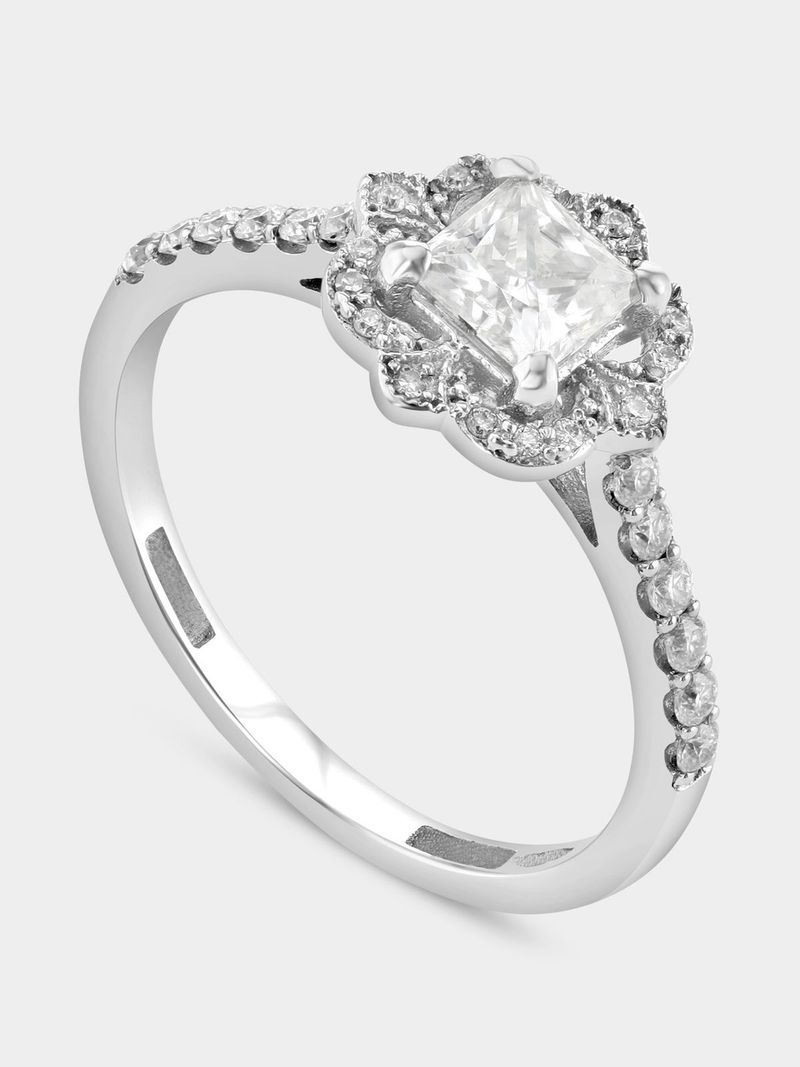 Expertly crafted in Sterling Silver, this regal ring features a princess-cut Moissanite embraced by a vintage-style cushion-shaped halo of pavé set stones that also glitter on the band’s shoulders. A pair of Created Blue Sapphires set in a flame-shaped embrace enhance the ring’s gallery, symbolising eternal love, truth and faithfulness.