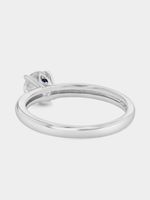 Expertly crafted in Sterling Silver, this beautiful ring features a round-cut Moissanite solitaire in an elegant 4-claw setting. A pair of Created Blue Sapphires set in a flame-shaped embrace enhance the ring’s gallery, symbolising eternal love, truth and faithfulness.