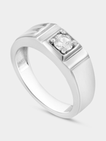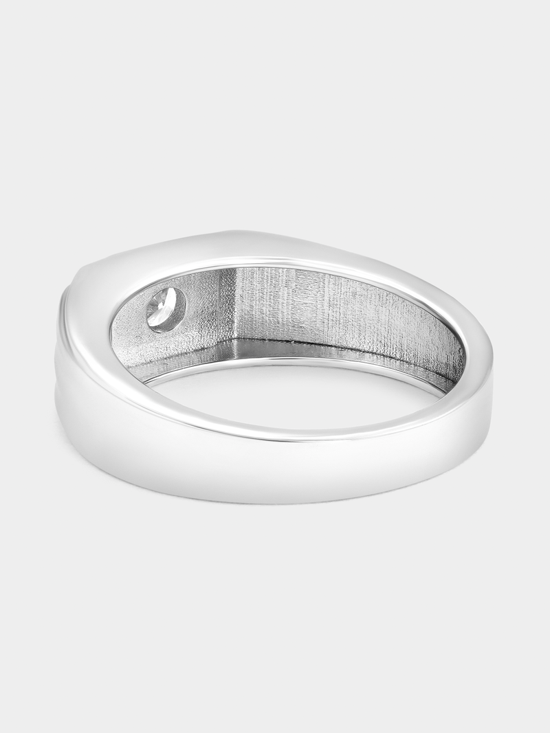 Expertly crafted in Sterling Silver, this stylish ring features a round-cut Moissanite in a square setting framed by a horizontal grooves design.