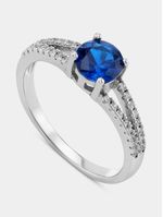 Expertly crafted in Sterling Silver, this regal ring features a round-cut Sapphire blue Cubic Zirconia and a split-shank band sparkling with pavé set white stones.