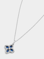 Expertly crafted in Sterling Silver, this beautiful clover pendant on a chain features a quartet of oval-cut Created Blue Sapphires embraced by round-cut Created White Sapphires and Earth Grown Diamond accents. The total Diamond weight is 0.01 carats.