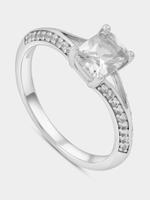 Expertly crafted in Sterling Silver, this beautiful ring features a rectangle-cut Created White Sapphire solitaire and split-shank band glittering with pavé set stones including Earth Grown Diamond accents. The total Diamond weight is 0.01 carats.