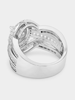 Expertly crafted in 5ct Yellow Gold and Sterling Silver, this opulent ring features a cluster of round-cut Created White Sapphires in a halo setting that includes Earth Grown Diamond accents and a band glittering with baguette-cut and round-cut stones.