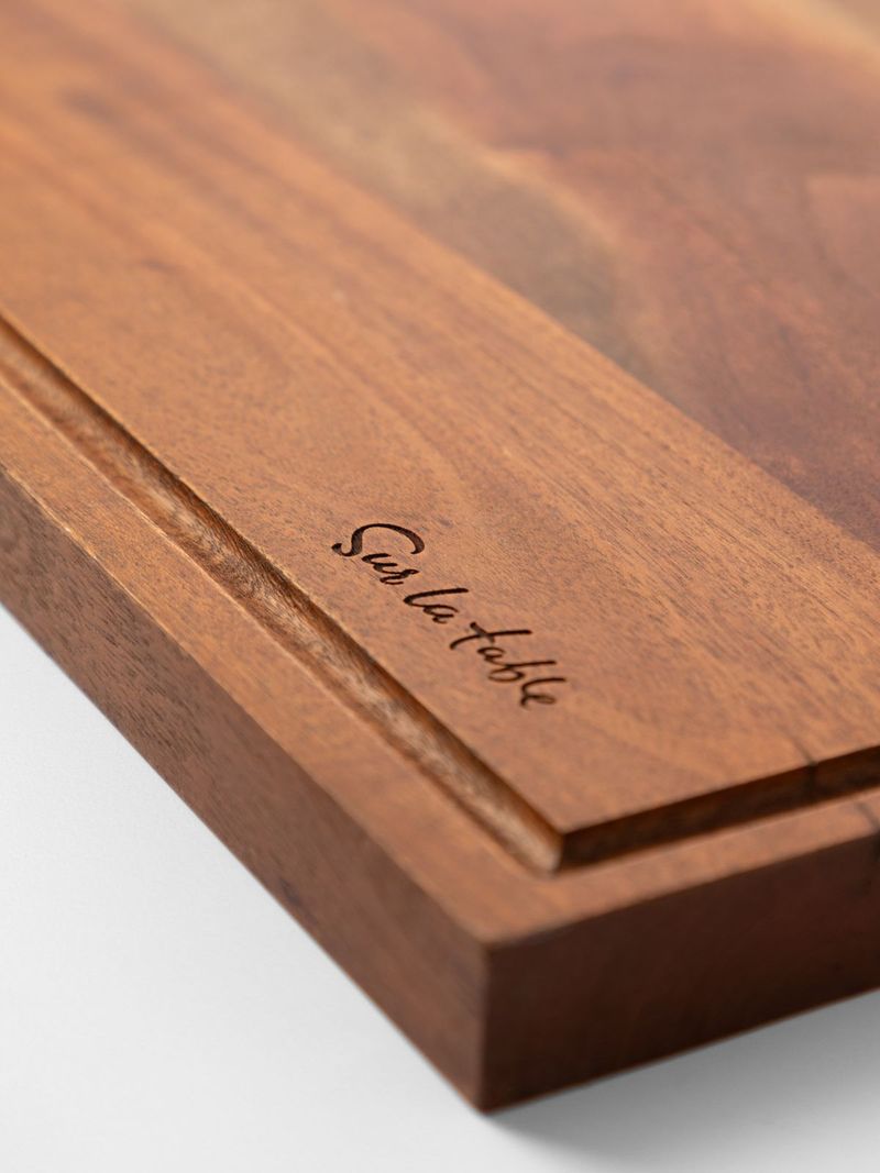 Carve roasts and more on the Sur La Table Wood Carving Board. This thick, heavy board is large enough to carve, with extra space to set the cut pieces aside while you work. Featuring a juice channel and two recessed grips, this solid wood board is designed thoughtfully for practical luxury.