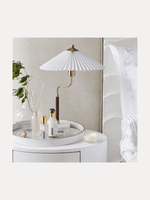 Bring old-world charm to your bedroom or living room with this elegant table lamp. It features a curved brass arm with wood detail on a marble base complemented by a pleated shade.
