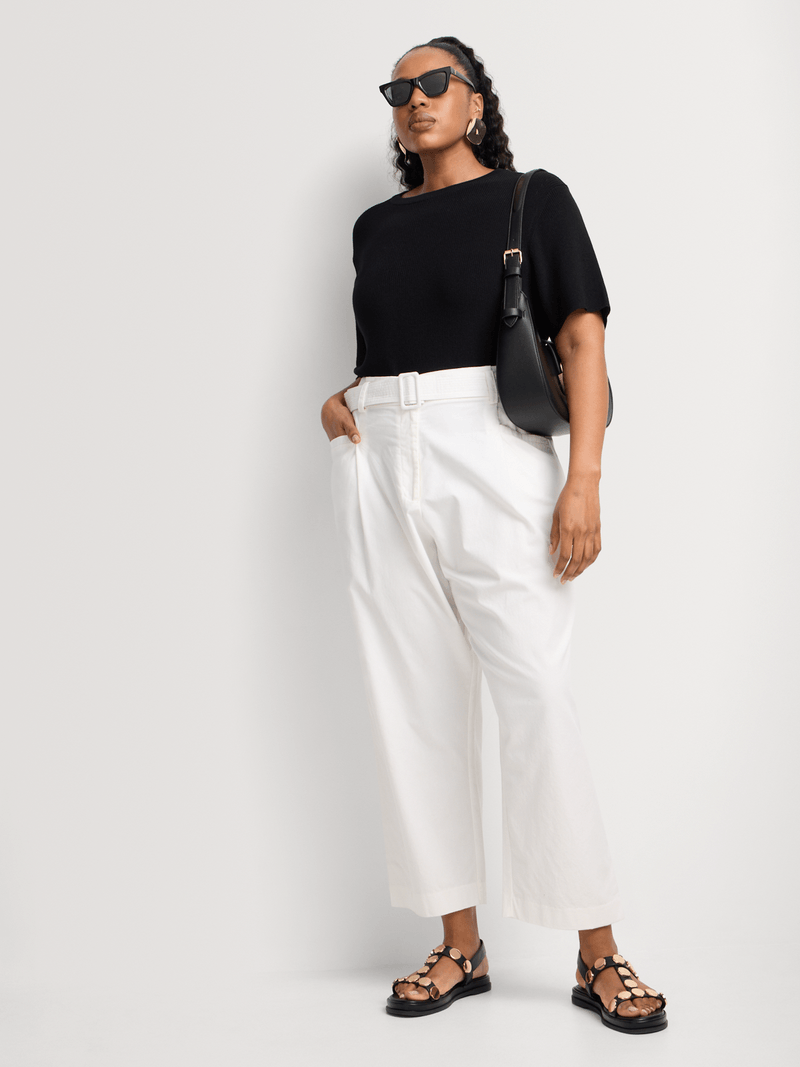 Lightweight and breathable, our Cotton Belted Waist Tapered Leg Pants are great for summer. Wear them with chic flats and a crew neck tee, or opt for a button-down shirt and block heels for a dressier take.
