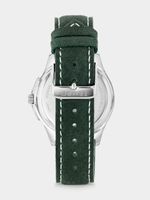 This stylish watch features a Silver Plated round case with a Black Plated top ring, green multi fashion dial and green genuine suede leather strap.