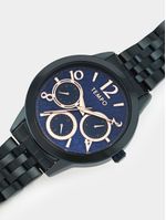 This stylish Blue Plated bracelet watch features a round case and blue and rose toned multifunction fashion dial.