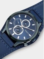 This stylish watch features a Blue Plated round case, multifunction fashion dial and blue genuine leather strap.